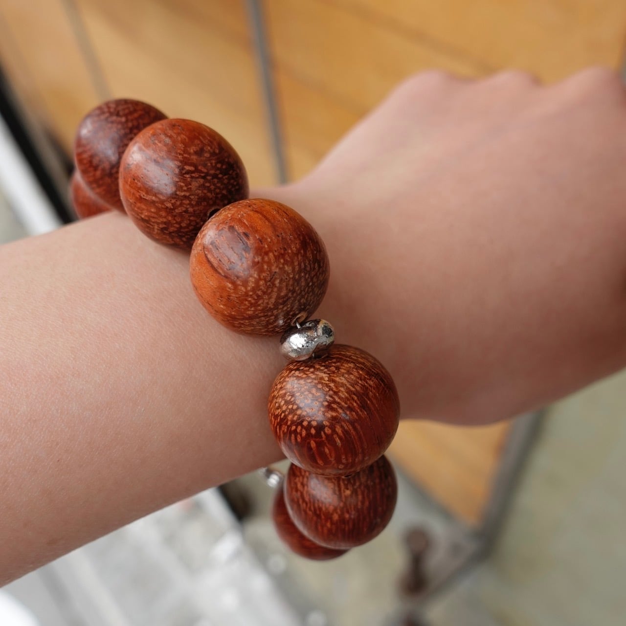 濡れるとウッドビーズが色落ちしてしまう可能性がありますので、なるべく濡らさず、濡れてしまった場合はすぐに拭くようにしてください。
