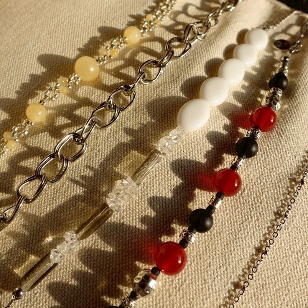 ※使用頻度によりビーズやチェーンなどのメッキ等色落ちがする場合がございます。ハンドメイド品のため多少サイズの差が出ますがご了承ください。